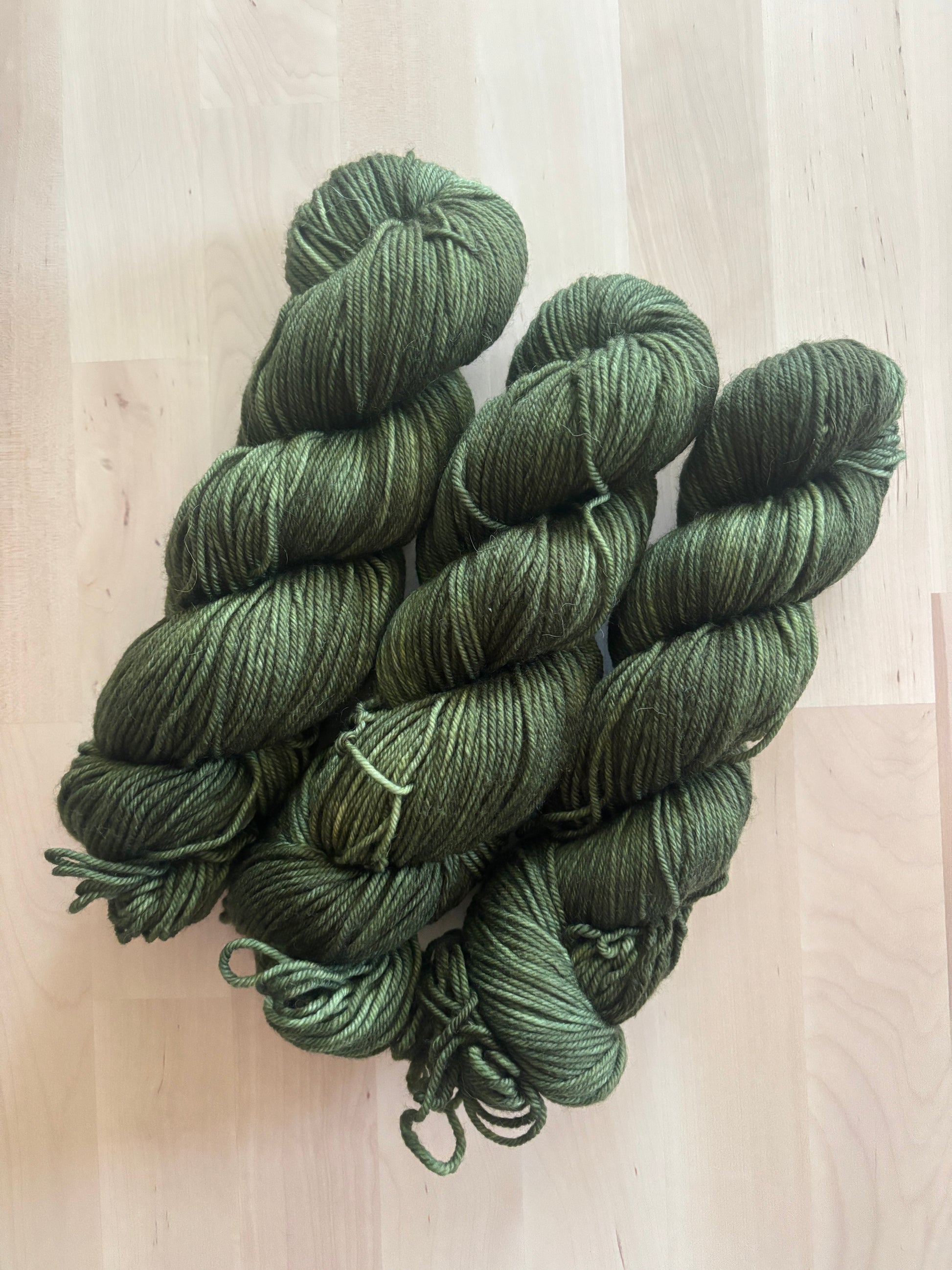 A deep green tonal yarn on our No Duh DK base. This yarn is almost exactly like Just Call Me Joe, but it's a bit lighter and has more variation in the tonality.